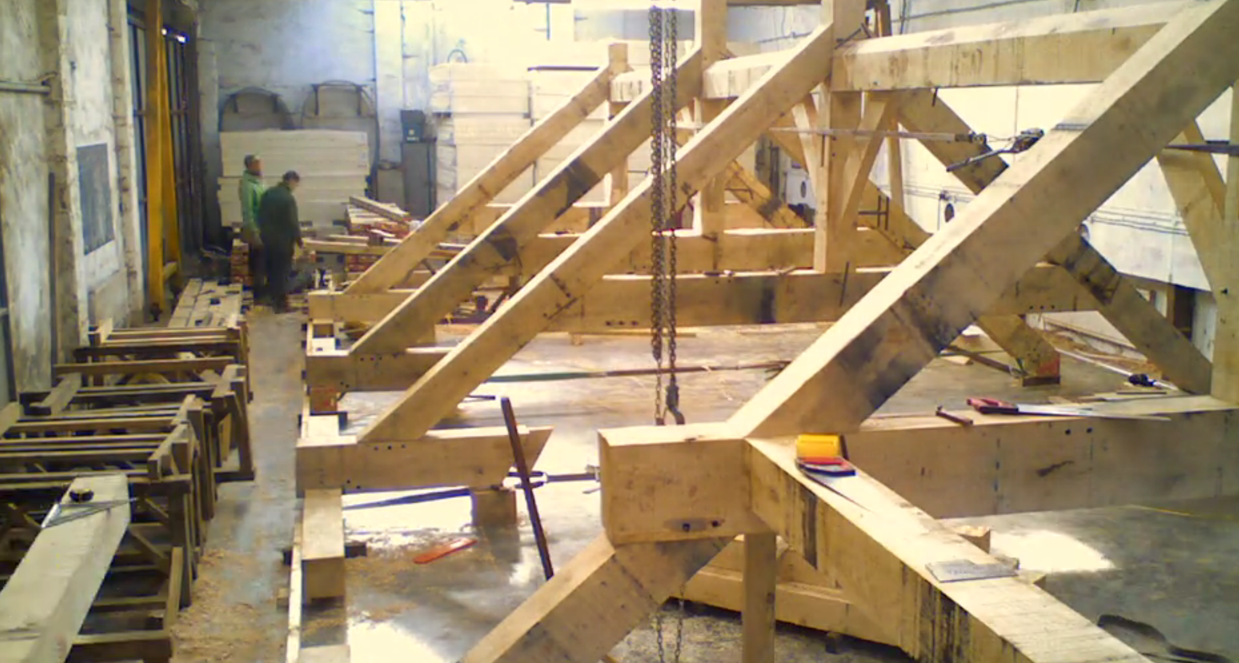 The video shows our team working from the point at which they assembled and added crown post detailing, which was then deconstructed and reassembled in situ to install both the principle and common rafters. They also prepared and cut the diamond hip ends of the roof.