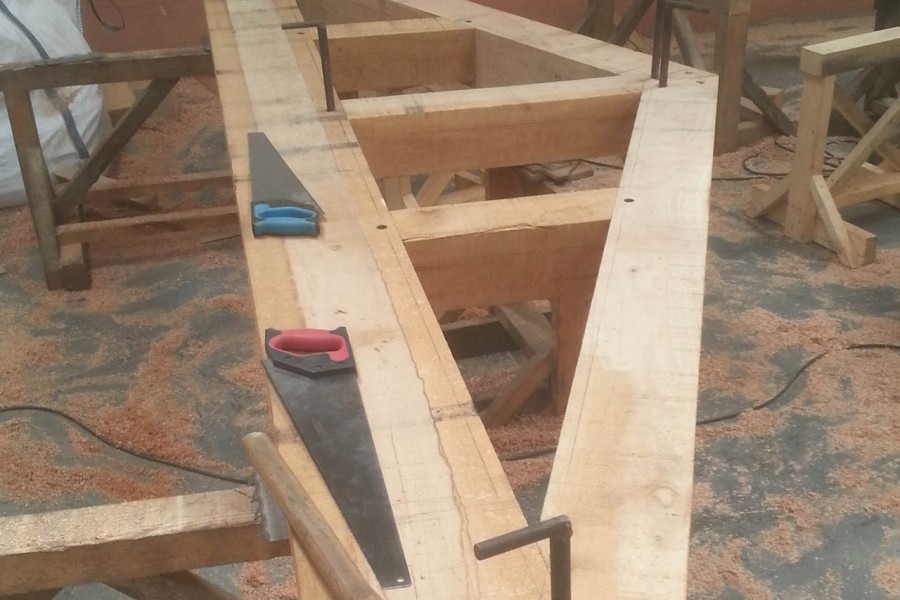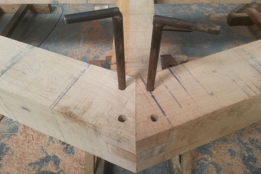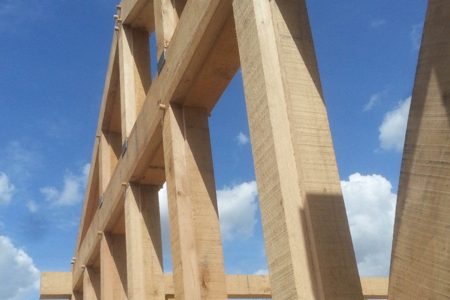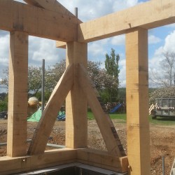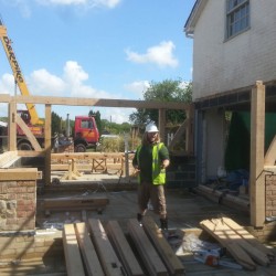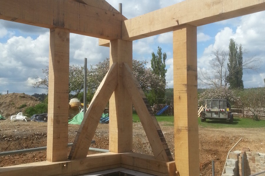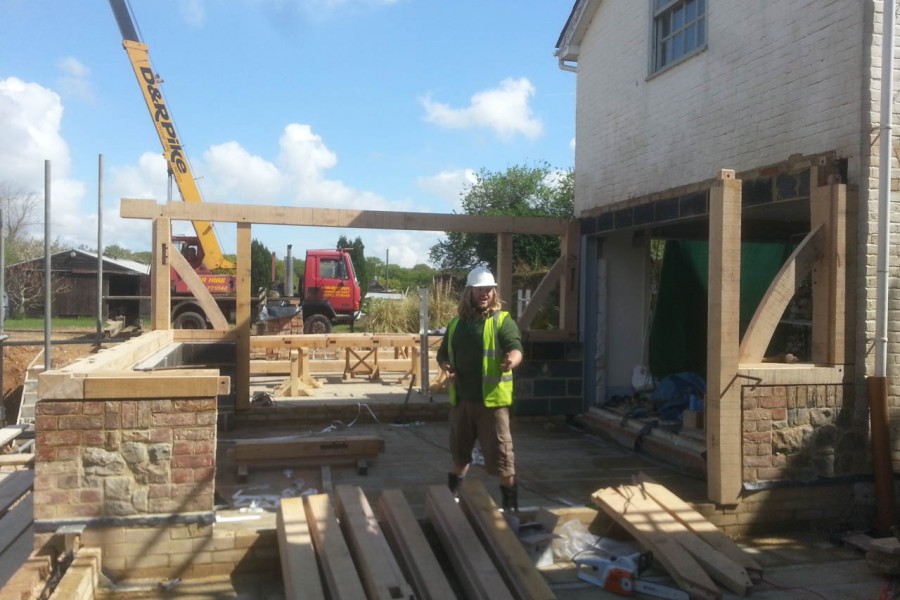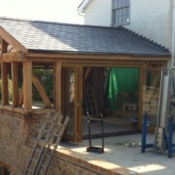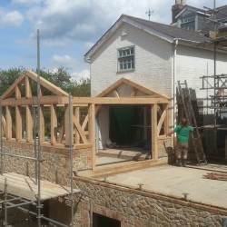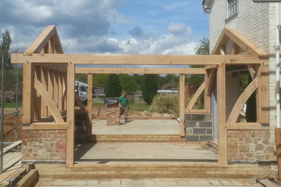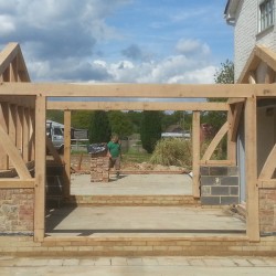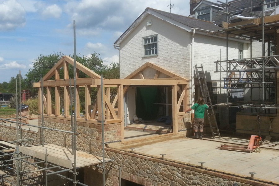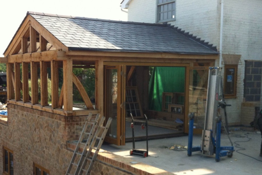 Constructed on top of a new basement room this oak frame sun room was designed to include large French doors to either side for connection with the surrounding grounds and also featured a fully glazed king post gable.